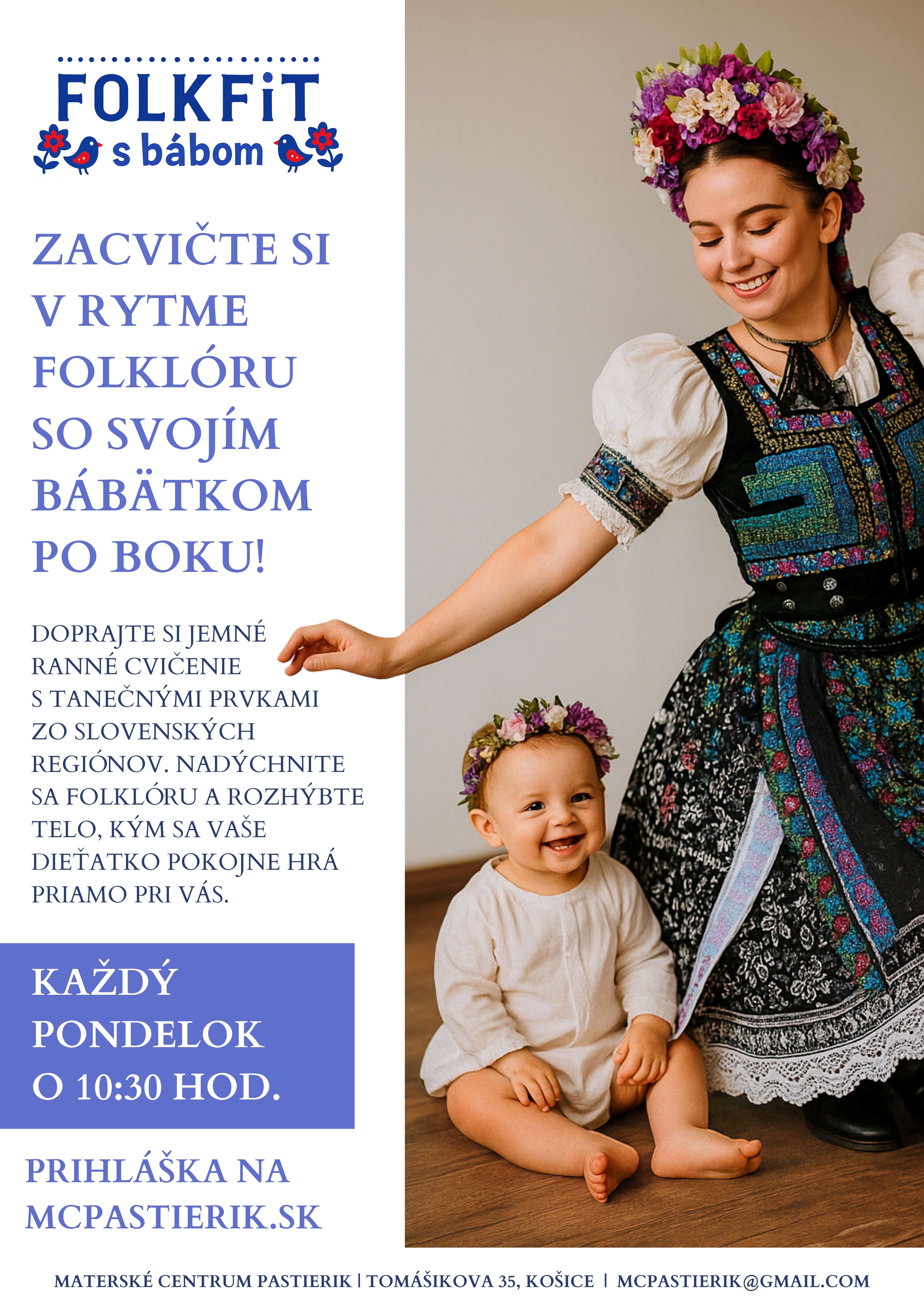 FolkFit s bábom je ranné cvičenie pre mamičky, ktoré si chcú rozhýbať telo v rytme folklóru – bez potreby zháňať stráženie. Vaše dieťa je počas lekcie priamo s vami v sále – môže sa hrať, váľať sa na podložke, sledovať svet okolo seba z bruška, posediačky sa hrať s našimi vkladačkami či skladačkami, alebo len tak chodiť okolo a spoznávať sálu aj ostatné deti.